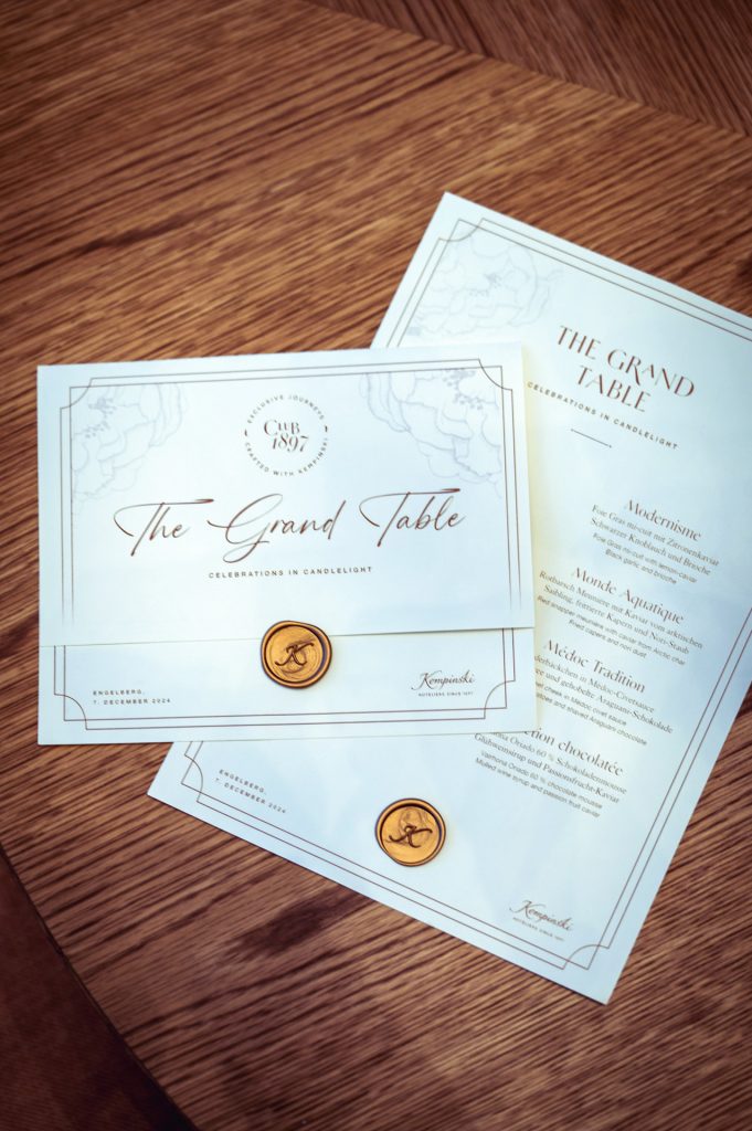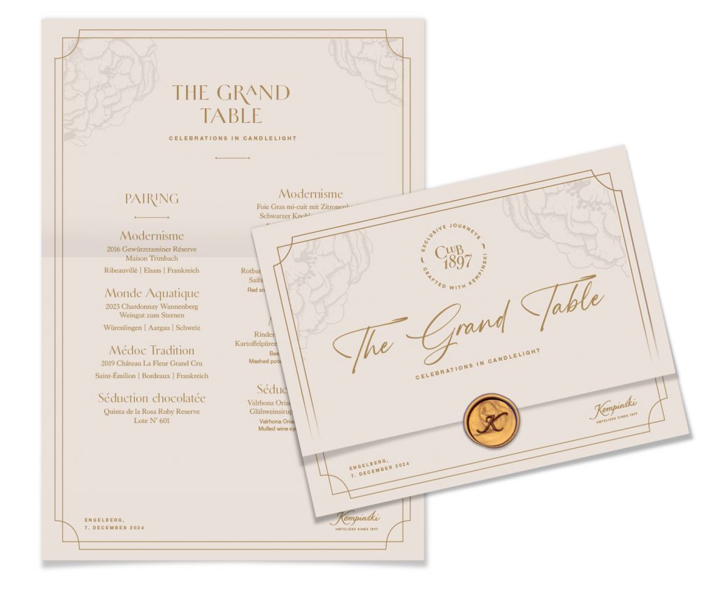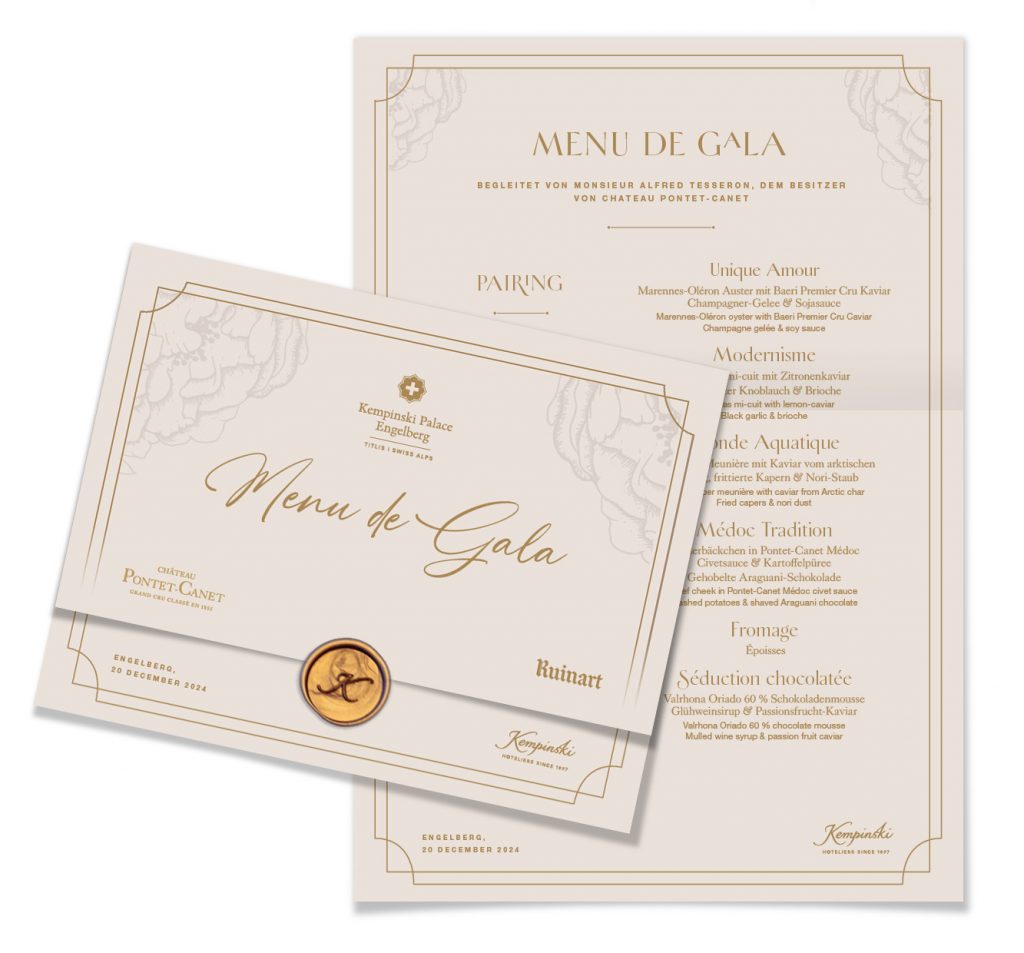 Konzept & Design der Menükarten für das Dinner vom Club 1897 und Pontet Canet (entstanden während meiner Arbeit beim 5-Sterne-Hotel “Kempinski Palace Engelberg”)